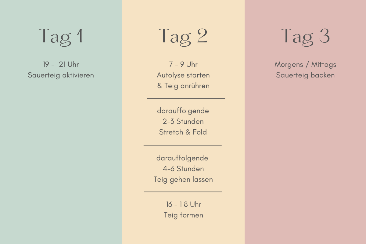 Brot mit Sauerteig zu backen ist ein drei tägiger Prozess. Durch die lange Teigführung ist das Brot am Ende allerdings viel bekömmlicher als konventionelles Brot. Damit du eine Vorstellung davon bekommst, wie der Zeitplan bei der Herstellung deines Brotes aussehen kann habe ich dir folgende Grafik zusammengestellt.